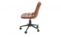 Für den heimischen Schreibtisch braucht es auch einen passenden Stuhl. So wie den Bürodrehstuhl Anglin. Die gesamte Sitzschale ist weich gepolstert und mit braunem Kunstleder bezogen. Die gesamte Vorderseite ist quadratisch gesteppt. Dank des kleinen Hebels unter der Sitzfläche können Sie den Drehstuhl in der Höhe verstellen. Das ist von 42 bis 50 Zentimeter möglich.