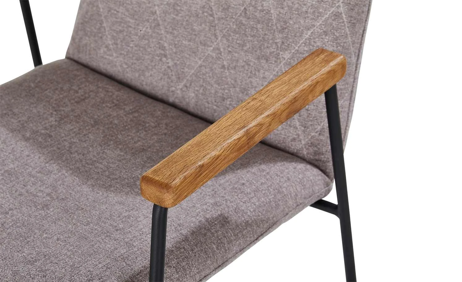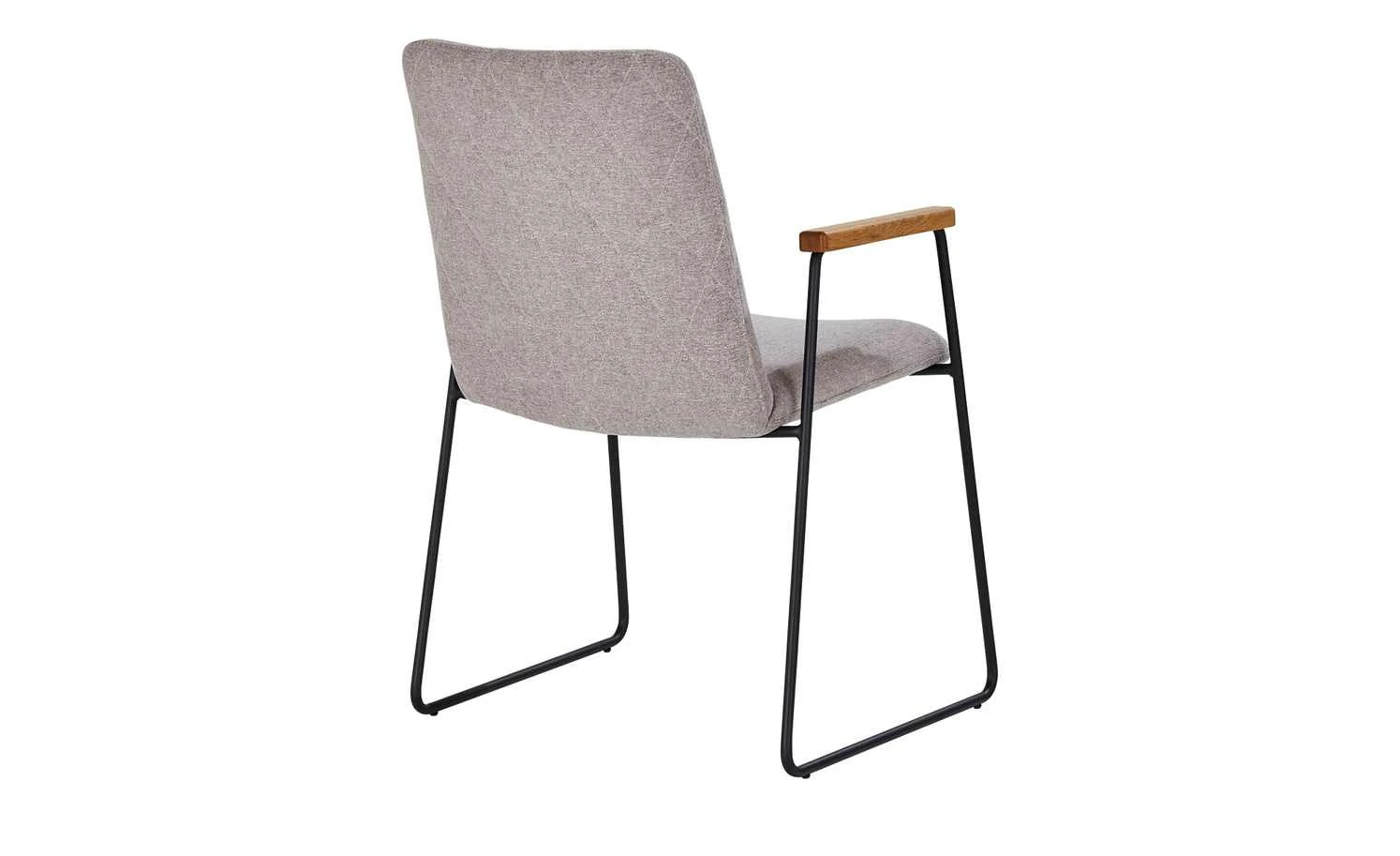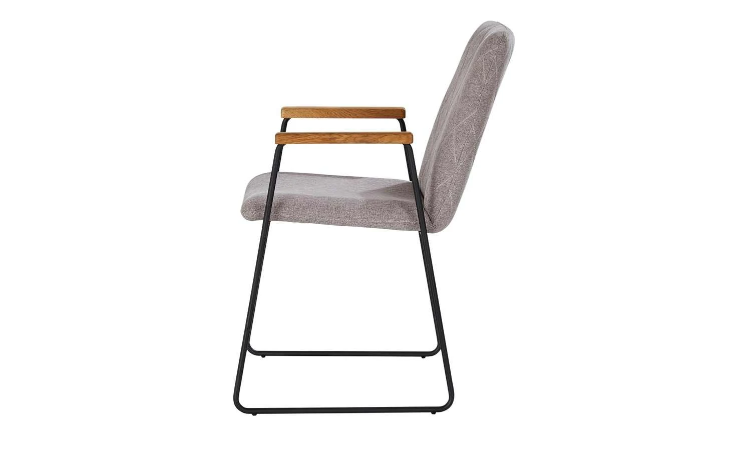Der Kufenstuhl Samu spielt mit geometrischen Formen. Seine trapezförmigen schwarzen Metallkufen wirken minimalistisch und modern. Sie lassen die dick gepolsterte Sitzschale scheinbar schweben. Der pflegeleichte Bezugsstoff ist an der Rückenlehne rautenförmig gesteppt: Und das beidseitig. Aus den verlängerten Metallkufen entspringen zwei Armlehnen. Sie sind aus echtem Eichenholz, welches zum Schutz lackiert wurde. Samu vereint Komfort und Design und wird so zu einem attraktivem Charakterstuhl mit Retro-Note.