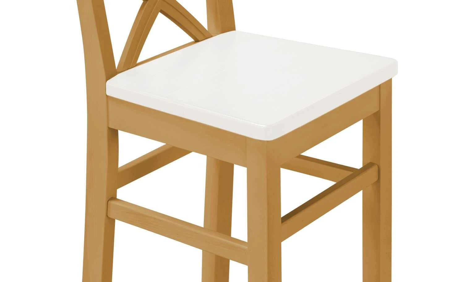 Florian ist die ideale Sitzgelegenheit für Tresen- und Bartische. Der Stuhl aus massiver Kiefer hat eine erhöhte Sitzfläche. Sie setzt sich farblich vom weißen Gestell und Rücken ab. Florian ist im Landhausstil gehalten – passend zu den anderen Möbeln der Serie.