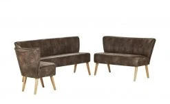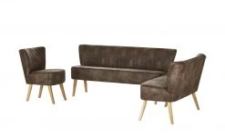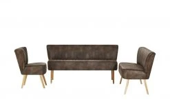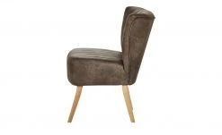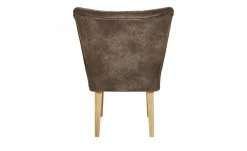 Einen coolen Vintage-Look hat der Polsterstuhl Bruce. Er ist mit braunem Kunstleder bezogen. Dieses ist alt und abgenutzt aus. Sitz und Rücken sind mit Längsnähten abgesteppt. Dank der Nosagfederung im Sitz sitzen Sie bequem.