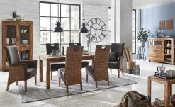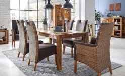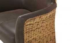Mit seiner besonderen, mediterranen Optik ist der Stuhl Antonio eine Bereicherung für den Essbereich. Die Rückseite und die Seiten der beiden Armlehnen sind mit einem attraktiven Rattangeflecht versehen. Der Sitzbereich, die Vorderseite der Lehne und Armlehnen sind mit Kunstleder bezogen. Der dunkle braune Farbton setzt sich schön vom Naturton des Rattans ab. Eine weiche Polsterung sorgt für ein angenehmes Sitzgefühl.