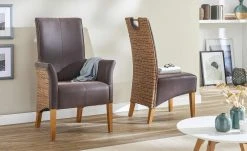 Mit seiner besonderen, mediterranen Optik ist der Stuhl Antonio eine Bereicherung für den Essbereich. Die Rückseite und die Seiten der beiden Armlehnen sind mit einem attraktiven Rattangeflecht versehen. Der Sitzbereich, die Vorderseite der Lehne und Armlehnen sind mit Kunstleder bezogen. Der dunkle braune Farbton setzt sich schön vom Naturton des Rattans ab. Eine weiche Polsterung sorgt für ein angenehmes Sitzgefühl.