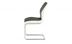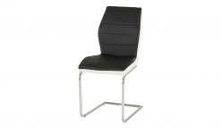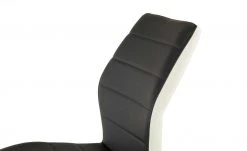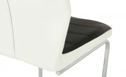 Der Schwingstuhl fällt durch seinen modernen Look in Schwarz-Weiß auf. Das schwarze, horizontal gesteppte Kunstleder wird an den Seiten in Weiß abgesetzt. Dank der weichen Polsterung sitzen Sie bequem. Für das Gestell ist verchromtes Metall verwendet worden.