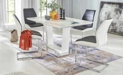 Der Schwingstuhl fällt durch seinen modernen Look in Schwarz-Weiß auf. Das schwarze, horizontal gesteppte Kunstleder wird an den Seiten in Weiß abgesetzt. Dank der weichen Polsterung sitzen Sie bequem. Für das Gestell ist verchromtes Metall verwendet worden.
