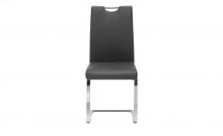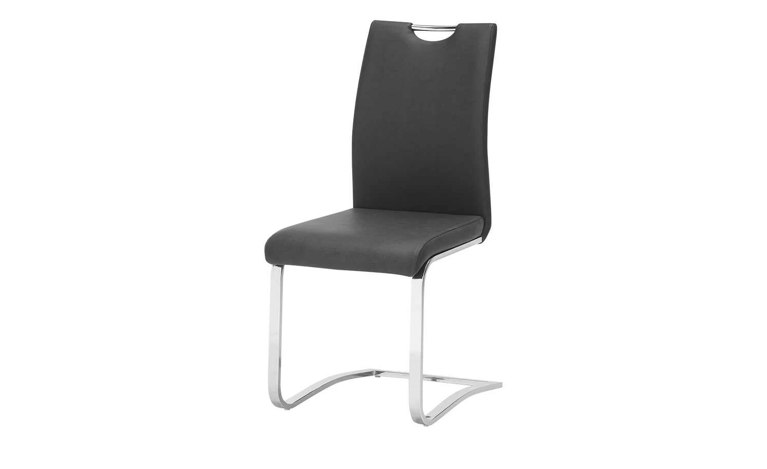 Der Schwingstuhl hat ein modernes Design in Anthrazit. Für den Bezug ist weiches Kunstleder verwendet worden. Es wird durch das verchromte Schwingstell und den Griff abgesetzt. Letzterer befindet sich am oberen Ende der Rückenlehne und vereinfacht das Bewegen des Stuhls.